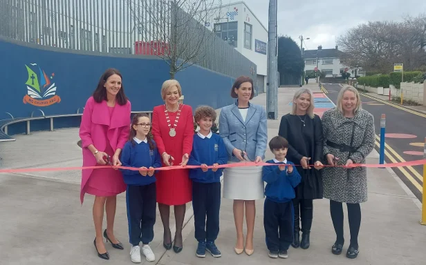 Minister Naughton, County Mayor Deirdre O’Brien, Valerie O’Sullivan from Cork County Council and Ellen Murphy from An Taisce cutting the ribbon to open our new Safe Route to School!