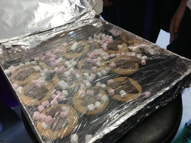 Then we made the s’mores using digestive biscuits, milk chocolate and marshmallows. Last we covered the box in cling film.