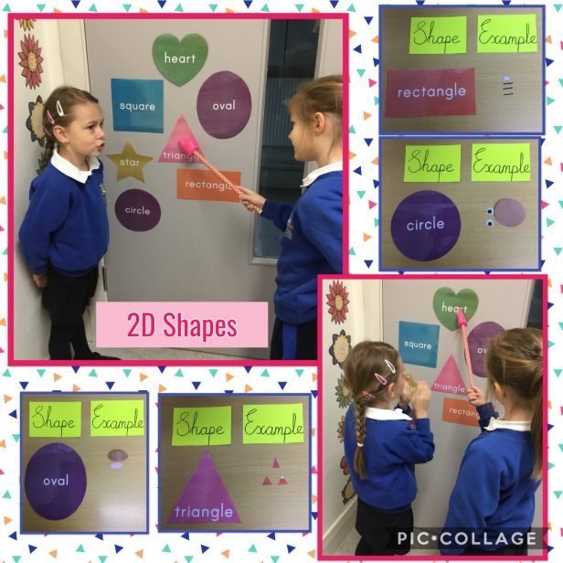 Junior Infants had great fun learning about shape names! The children identified lots of different 2D shapes in our EAL classroom including a pink triangle, a green heart, a blue square, a yellow star, an orange rectangle and a purple oval. The children matched shape names to shape examples in a sorting activity. They used the teacher’s pointer in a question and answer session. In the pictures below, Rafaela is answering questions posed by Oliwia. The children loved taking turns playing teacher! Every child was awarded a star sticker for excellent speaking and listening skills … these shapes were a big hit!!! ⭐️