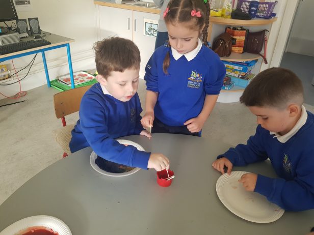 We covered the bottom of paper plates with milk, then add drops of different food colouring colours and then dipped cotton buds into the plate.